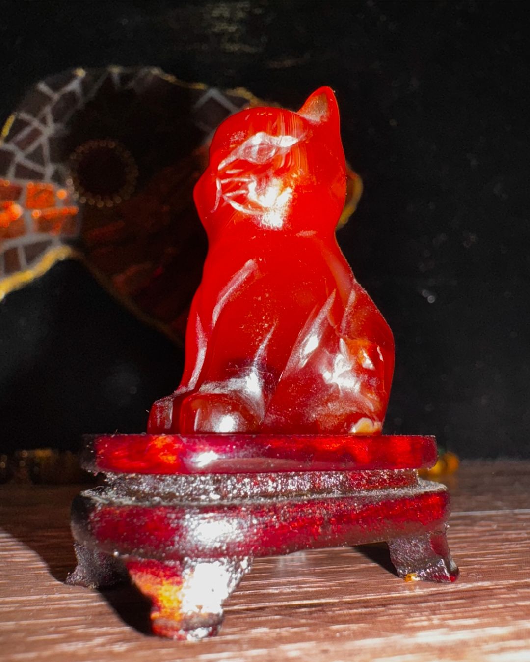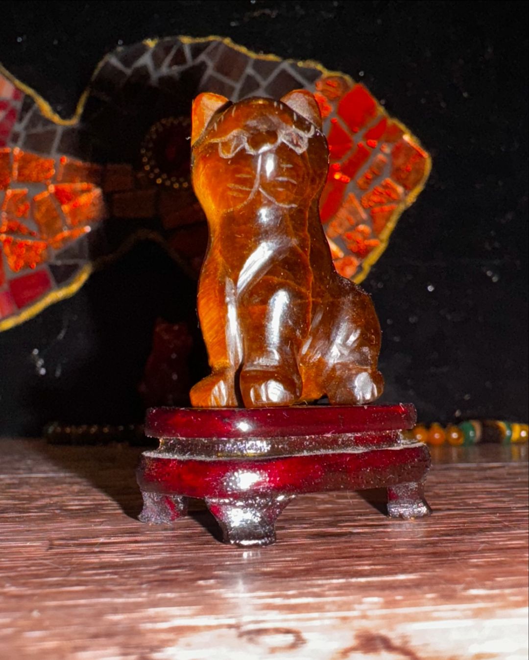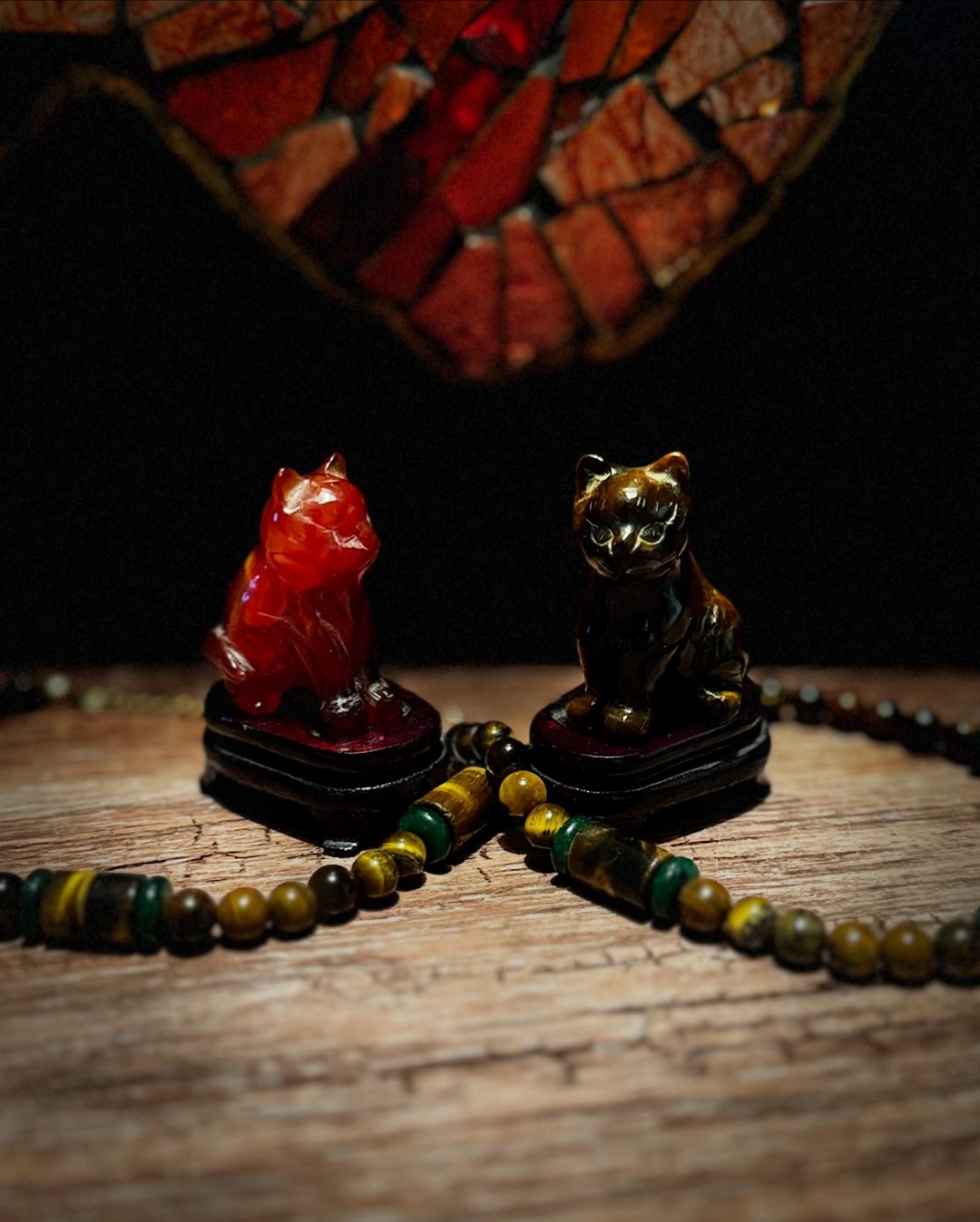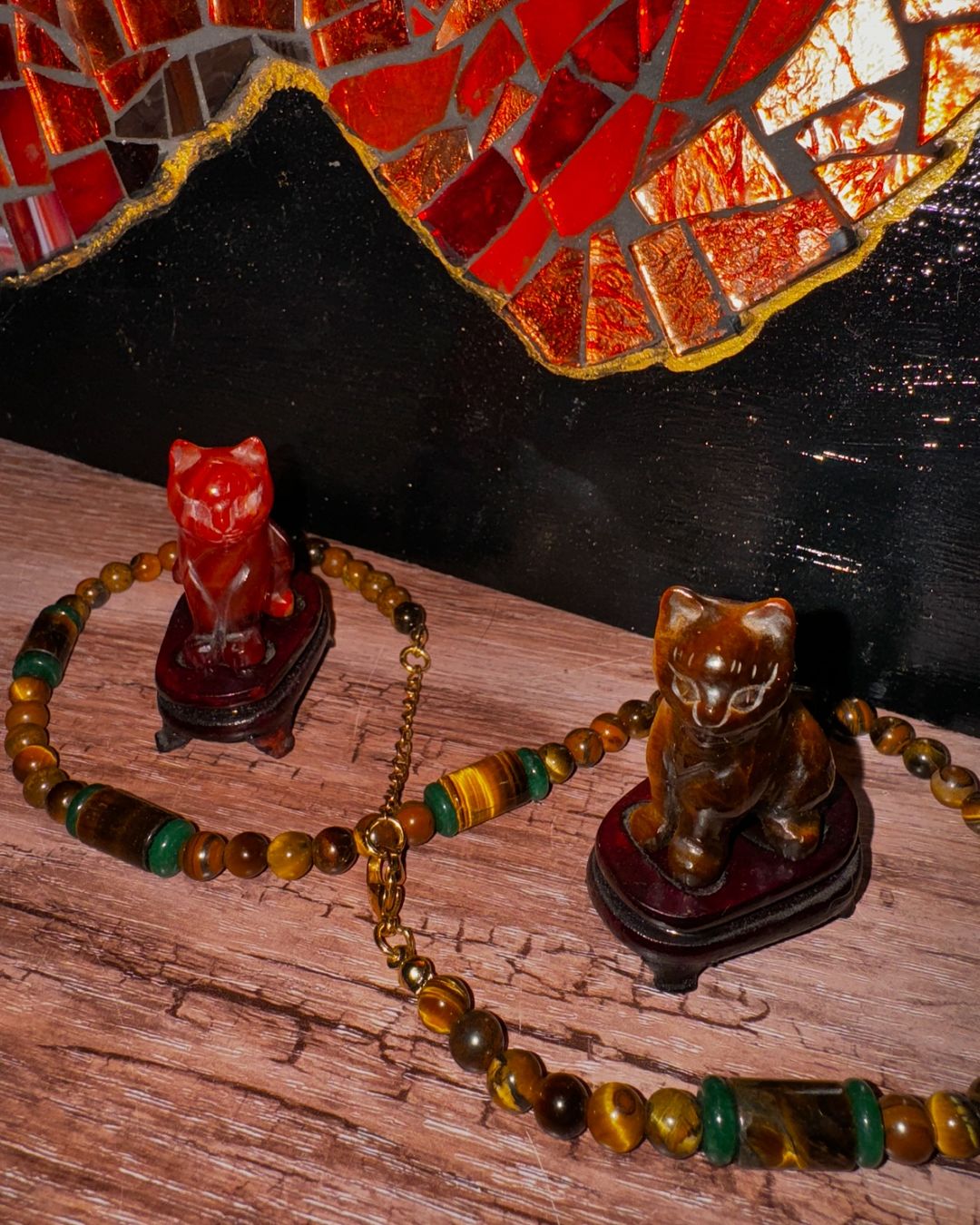 Twee schattige tijgeroog en carneool katjes met bijbehorende display van geolied hout. Prijs is per stuk.