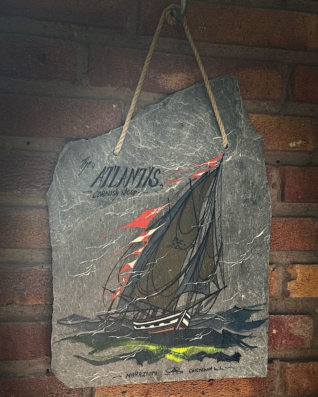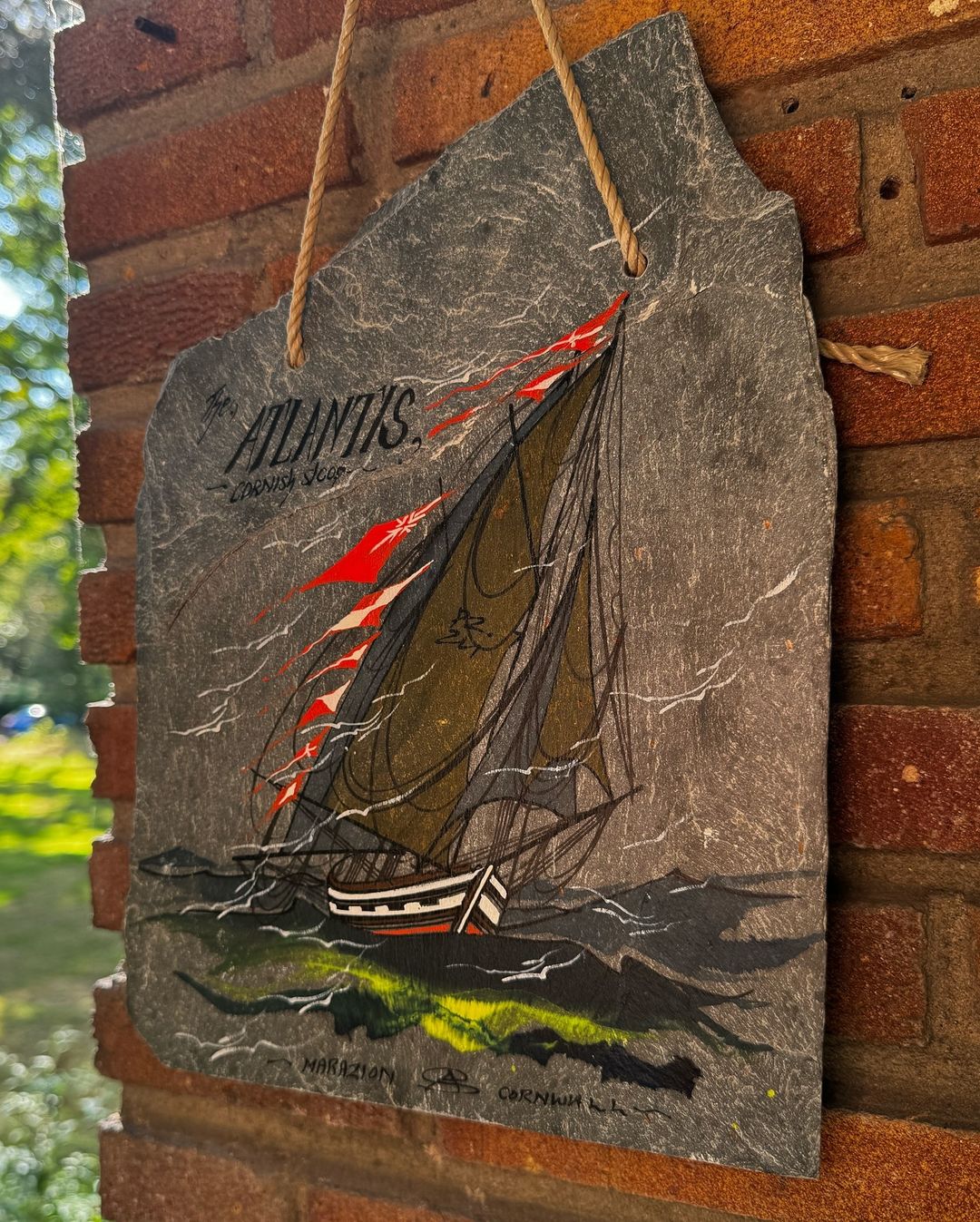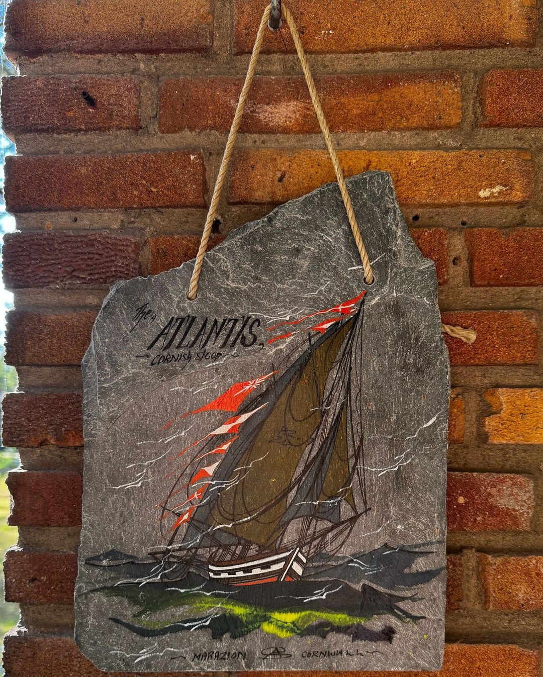 Vintage “the Atlantis, Cornish sloop”schilderij op Cornish leisteen door Anthony Star.