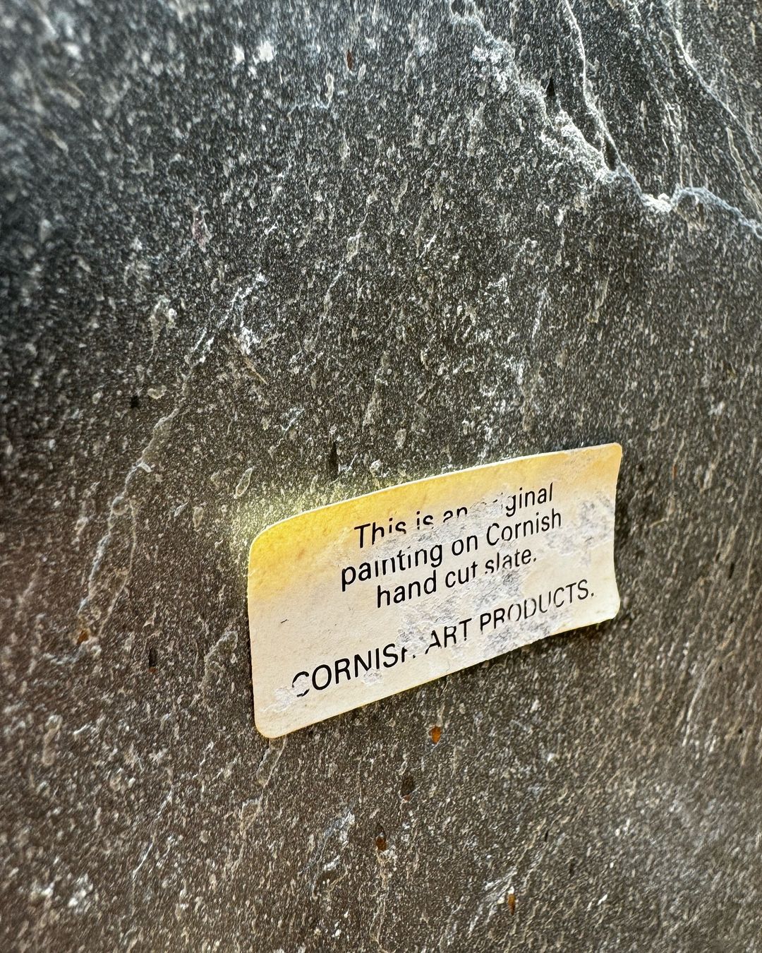 Vintage “the Atlantis, Cornish sloop”schilderij op Cornish leisteen door Anthony Star. Stickerlabel op de achterkant, gemaakt in Fowey, Cornwall. Afkomstig uit de jaren 80/90 en is nog in uitstekende staat. Deze style van schilderen geeft een bijzonder effect op deze steensoort. Leisteen is een natuur product uit verschillende steen en edelsteen soorten, dit is zo gegroeid en ontstaan. Het is een Tibetaanse traditie om de mantra van Chenrezig uit te hakken in deze stenen. Tibetanen geloven stellig dat dit positieve energie creëert en bescherming biedt.