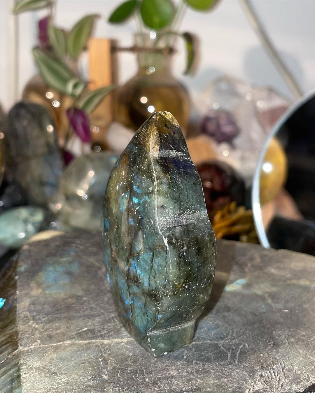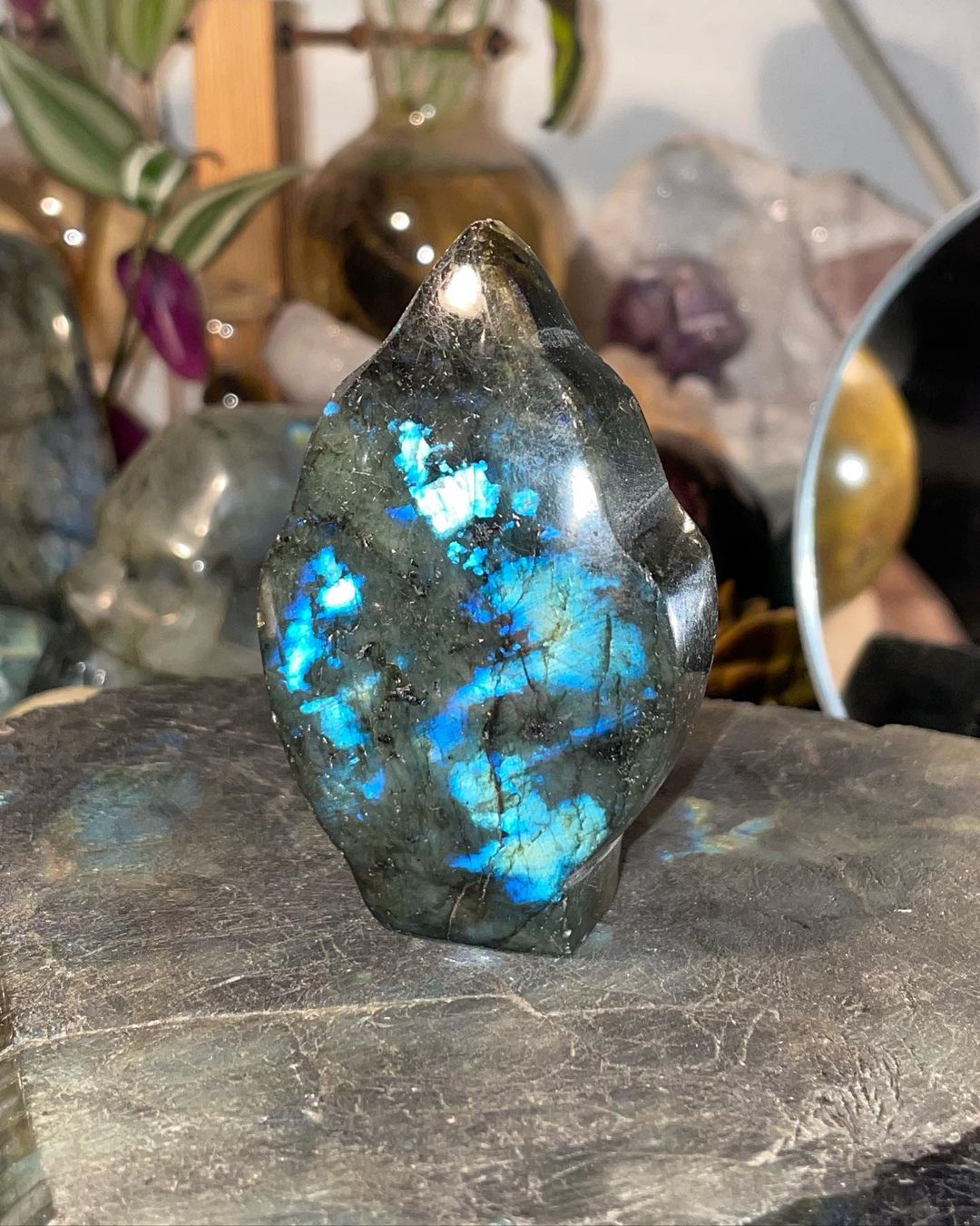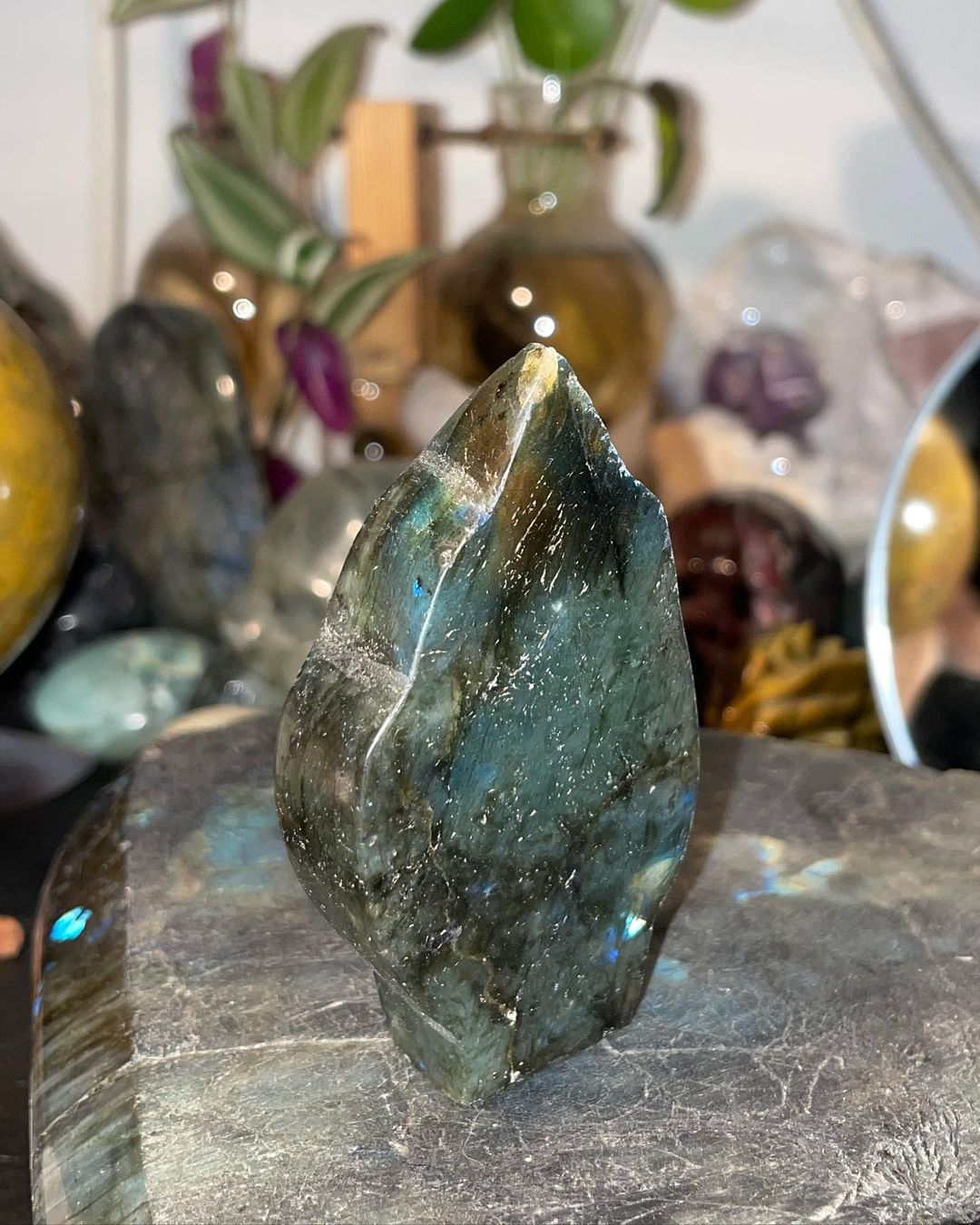 De vlam staat voor transformatie, licht, sensualiteit en draagt de kracht van vuur mee. Edelsteen vlammen zijn echte pronkstukken en kunnen overal neergezet worden. Je kunt ze in een ruimte plaatsen of haar energie gebruiken in een grid. De vlam is gepolijst en heeft een gedraaide vorm die bovenin uitkomt in een punt, dit zorgt voor een krachtige energiestroom.